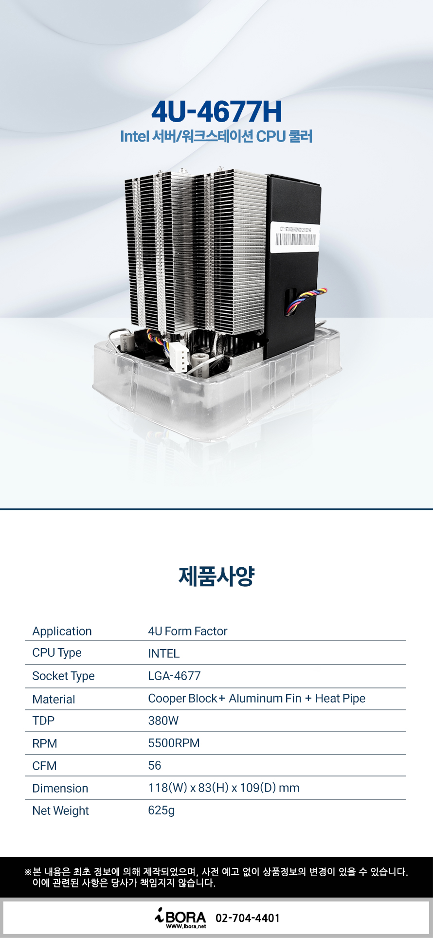 CPU 쿨러 / 공랭 / 서버용 / 팬 쿨러 / TDP : 380W / [호환/크기] Intel 소켓 : LGA4677 / 가로 : 118mm / 세로 : 83mm / 높이 : 109mm / 무게 : 625g / 5500 RPM / 최대 풍량 : 56 CFM / non-LED