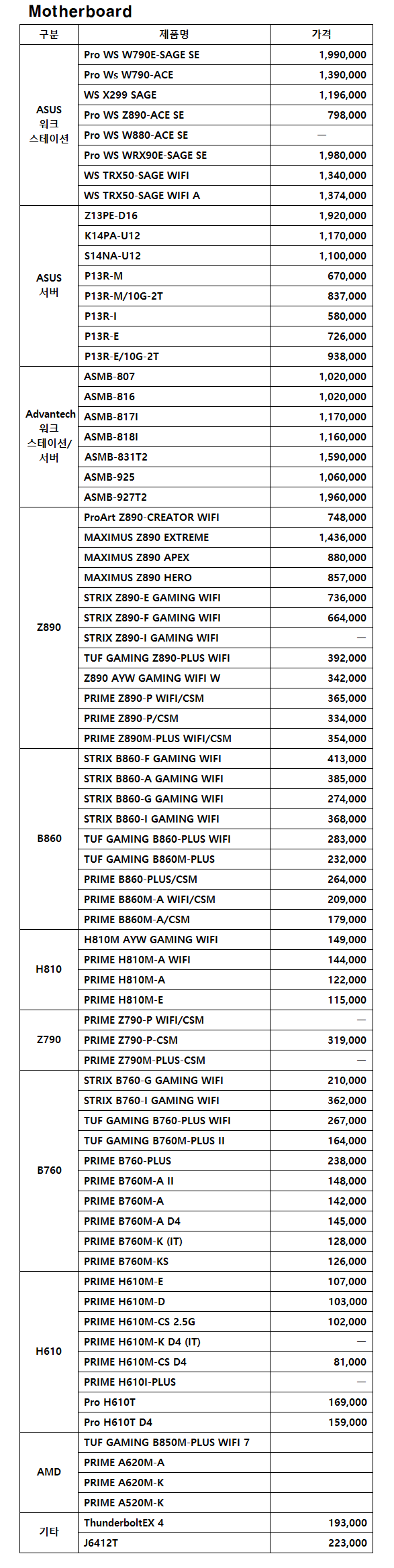 ASUS 가격표