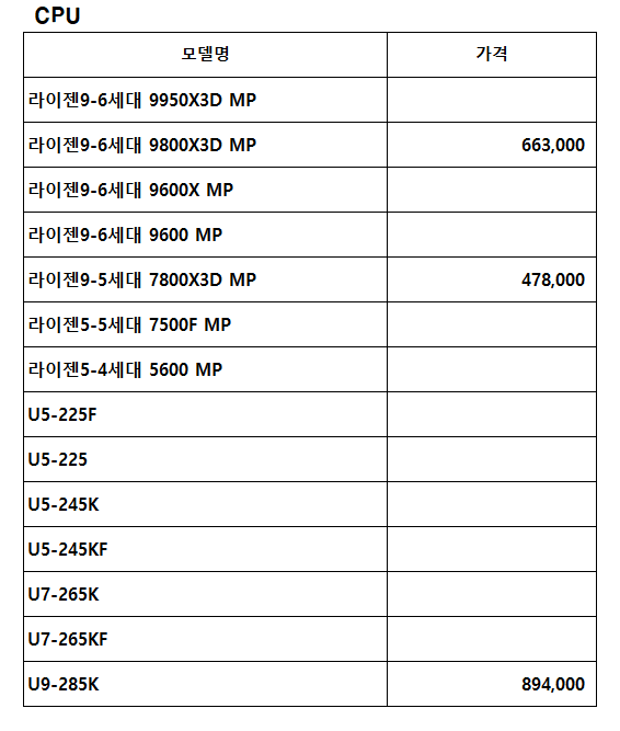 CPU 가격표